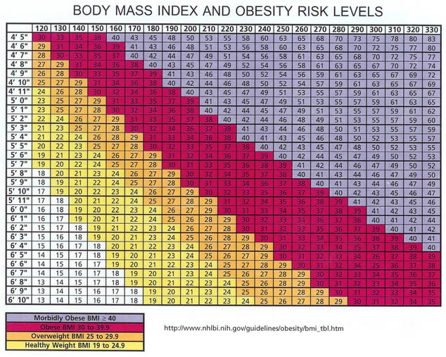 Ideal body weight is determined by your body shape and height. These are also the factors that determine your risk for cardiac events. Increased weight leads to higher blood pressure, higher incidence of diabetes, and increased chance of heart attack. Remember to discuss any weight issues with your physician. Please follow this link for the recommended height/weight Body Mass Index chart.